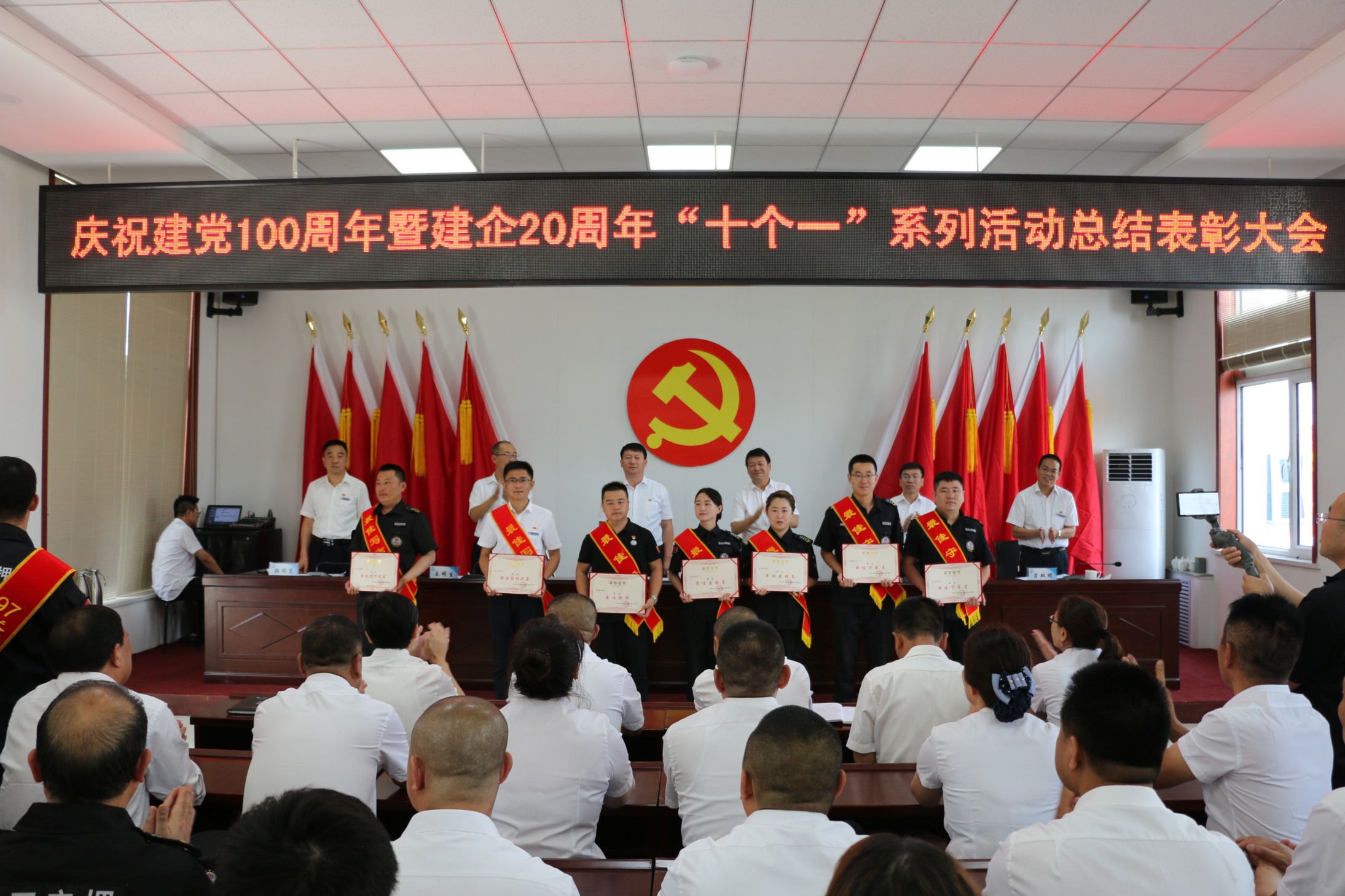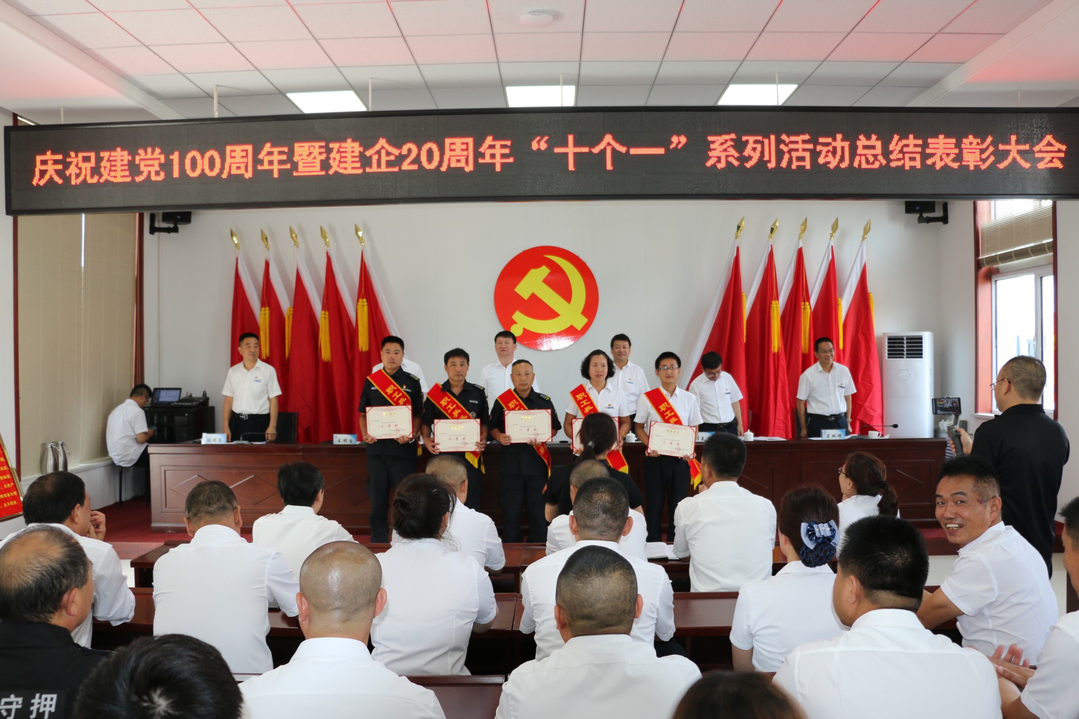 集團公司黨委委員邢春生同志宣讀了《關(guān)于表彰集團公司慶祝建黨100周年暨建企20周年“十個一”系列活動獲獎集體、獲獎個人的決定》;黨委委員、副總經(jīng)理王明生同志向大會通報了今年上半年受到上級表彰的先進集體和個人。