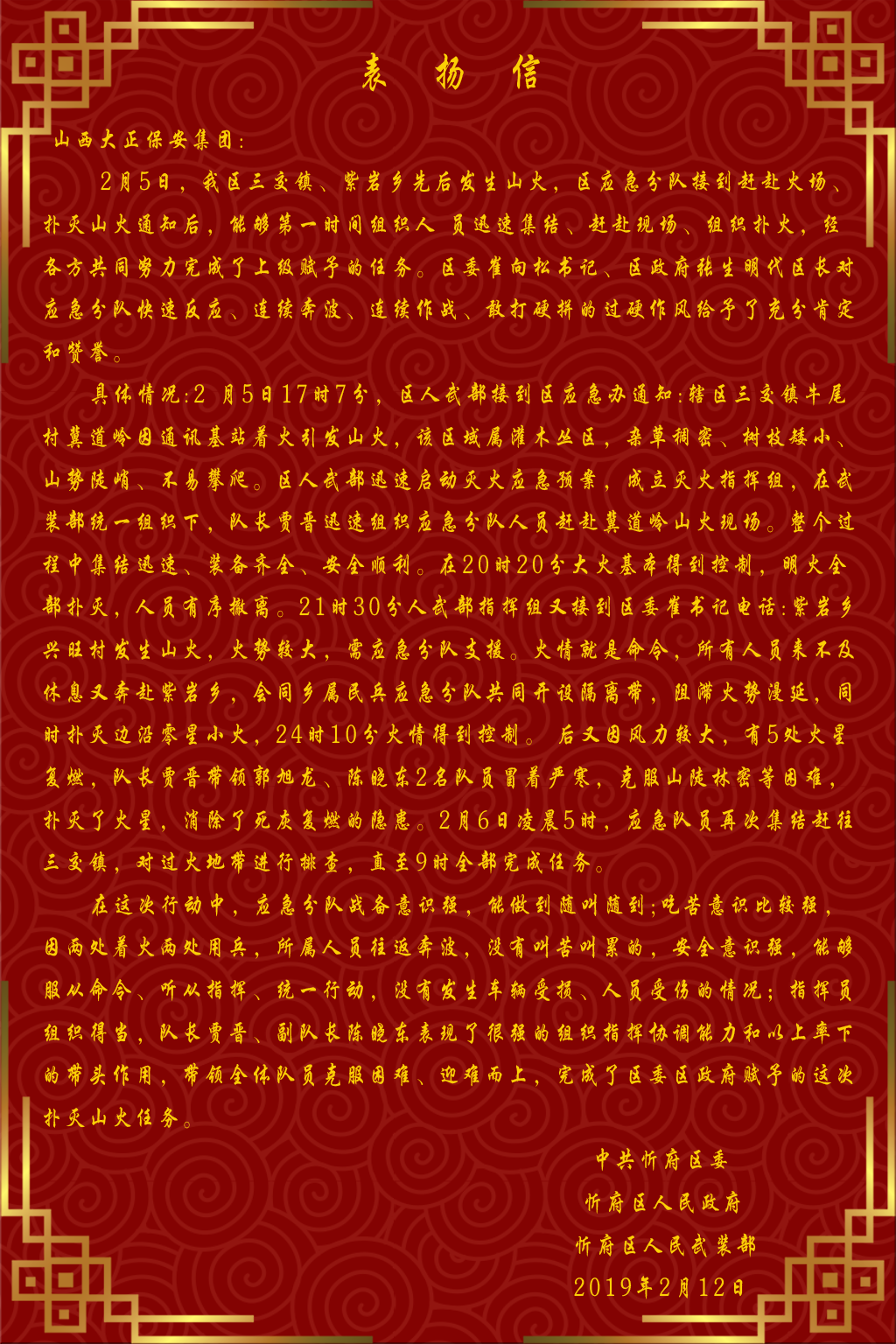 另外,2月5日,忻府區(qū)三交鎮(zhèn)、紫巖鄉(xiāng)先后發(fā)生山火,區(qū)應急分隊接到趕赴火場、撲滅山火通知后,公司在第一時間組織應急人員迅速集結(jié)、趕赴現(xiàn)場、組織撲火,全體隊員攻堅克難、英勇奮戰(zhàn)、連續(xù)奔波、連續(xù)作戰(zhàn),經(jīng)各方共同努力圓滿完成了上級賦予的滅火任務,得到了忻府區(qū)委崔向松書記、張生明代區(qū)長的充分肯定和贊譽。此外,中共忻府區(qū)委,忻府區(qū)人民政府,忻府區(qū)人民武裝部專程來公司送來表揚信,對公司應急隊伍完成此次救火任務,展示了公司隊伍良好形象進行了表揚。