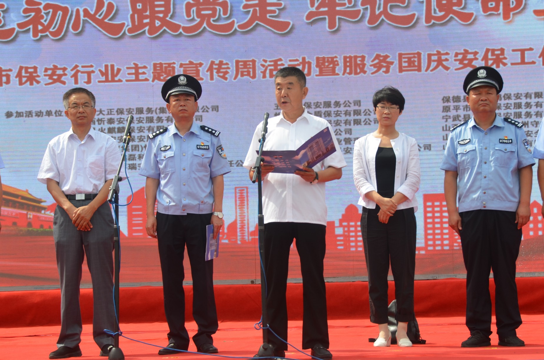 市保安協(xié)會(huì)會(huì)長(zhǎng)、山西大正保安服務(wù)有限公司黨委書記、董事長(zhǎng)張躍生作動(dòng)員講話,要求全市廣大保安企業(yè)和保安員要認(rèn)真落實(shí)市公安局、市保安協(xié)會(huì)安排部署,統(tǒng)一思想認(rèn)識(shí)、提高政治站位,進(jìn)一步增強(qiáng)使命感、責(zé)任感和緊迫感,創(chuàng)新工作思路、拓寬活動(dòng)形式、豐富活動(dòng)內(nèi)容、深化活動(dòng)內(nèi)涵,廣泛開(kāi)展安全防范宣傳、志愿服務(wù)和崗位練兵等工作,用實(shí)際行動(dòng)為“平安忻州”建設(shè)添磚加瓦,為“二青會(huì)”成功舉辦增光添彩,為新中國(guó)70周年大慶保駕護(hù)航。