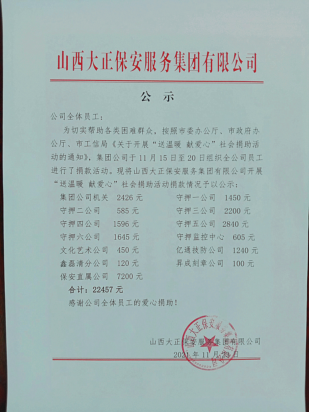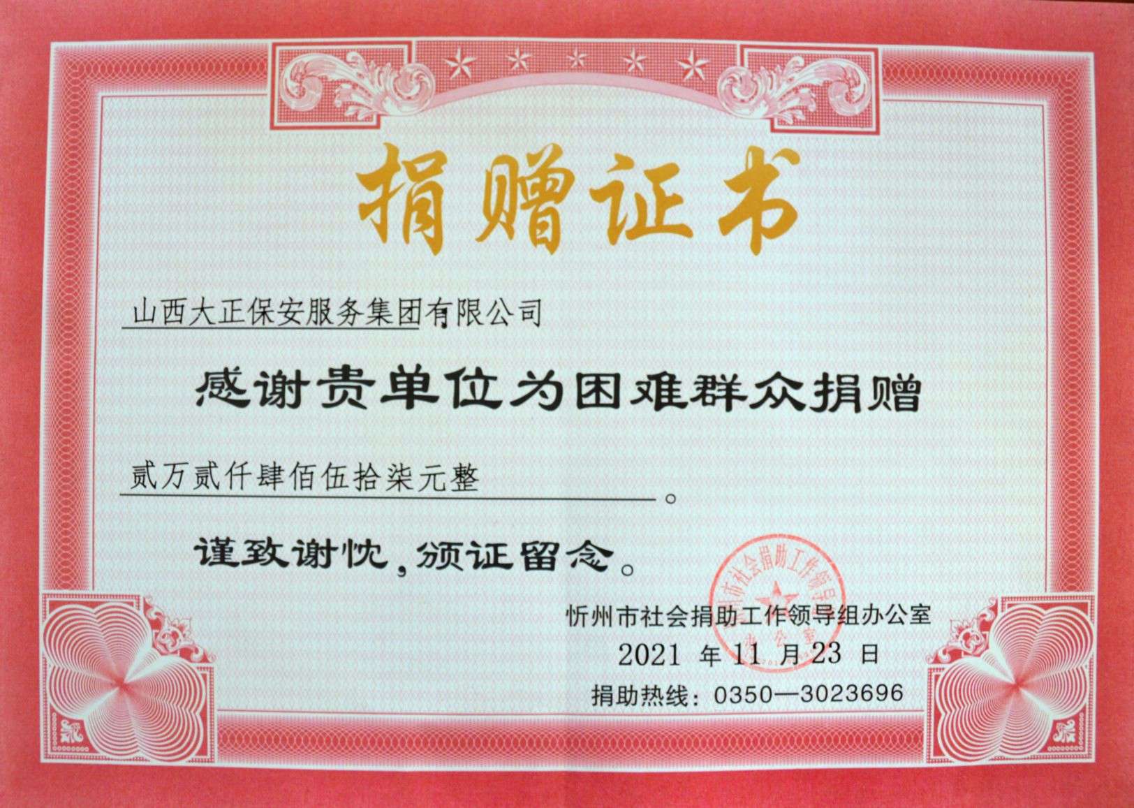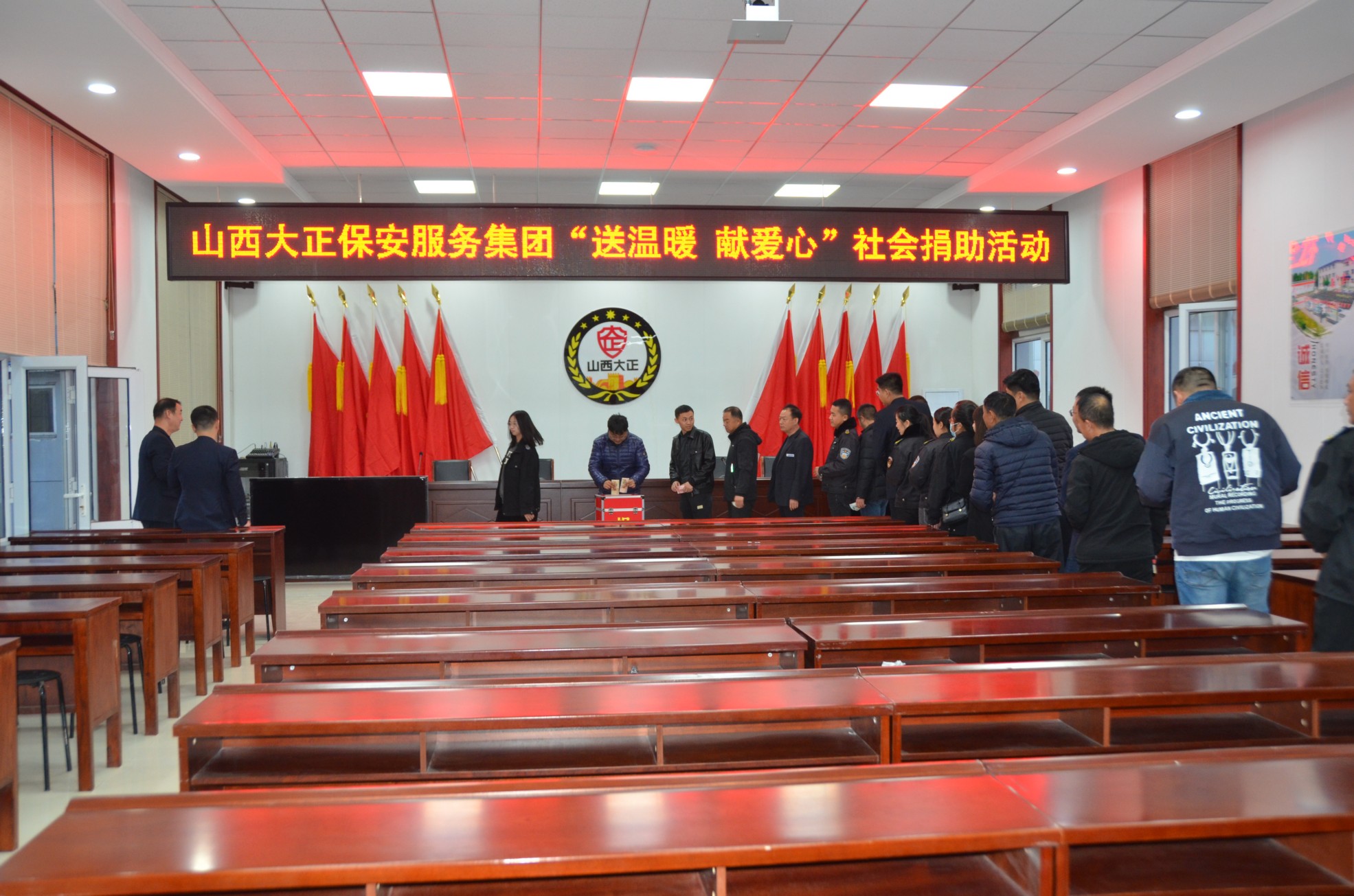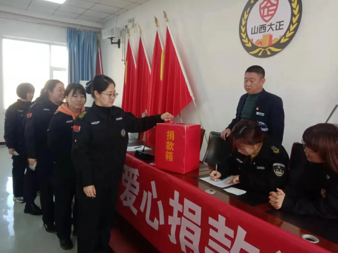 11月15日,集團(tuán)公司組織領(lǐng)導(dǎo)班子成員及總部駐地全體員工在大會(huì)議室參加了社會(huì)捐助活動(dòng)。本次捐助活動(dòng),彰顯了山西大正保安集團(tuán)廣大員工的奉獻(xiàn)擔(dān)當(dāng)精神,也激發(fā)了公司全體員工扶危濟(jì)貧的愛心,在全公司上下營(yíng)造了無私奉獻(xiàn)、助人為樂的濃厚氛圍。