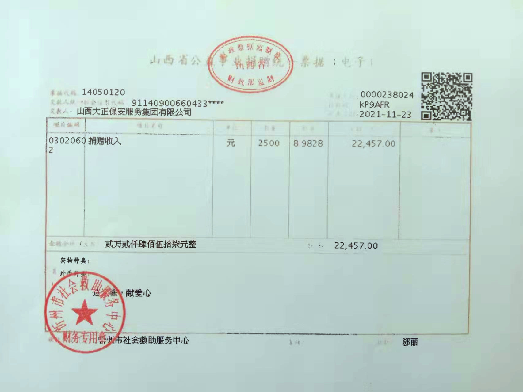 與此同時(shí),公司基層各級(jí)黨組織和黨員領(lǐng)導(dǎo)干部充分發(fā)揮表率作用,帶頭宣傳動(dòng)員,帶頭捐款獻(xiàn)愛心,以實(shí)際行動(dòng)影響和帶動(dòng)廣大干部職工在各所屬駐地相繼踴躍開展、參與了捐助活動(dòng)。一筆筆捐款,代表著山西大正保安集團(tuán)廣大職工的一份份愛心,詮釋著大正保安人對(duì)社會(huì)的拳拳愛心,短短幾天時(shí)間,我公司共收到員工社會(huì)捐款22457元。