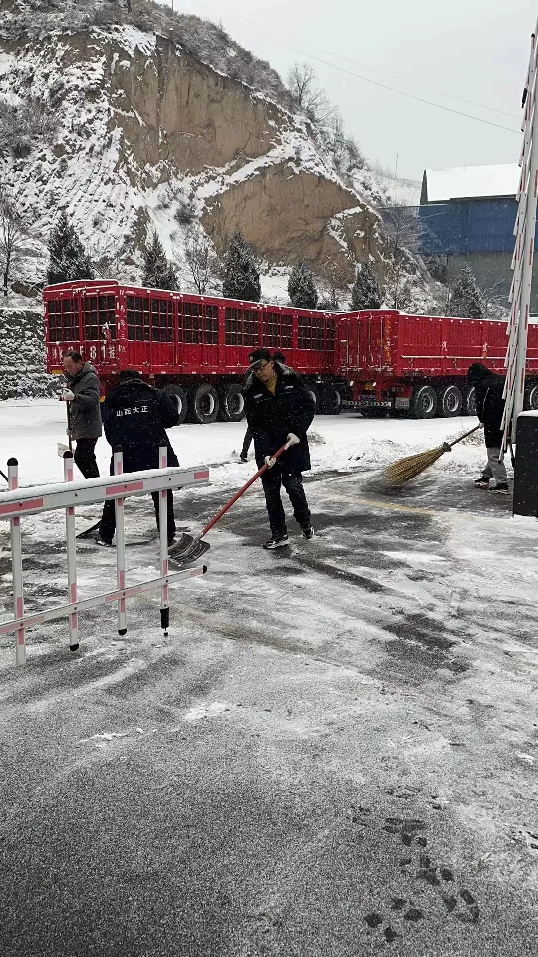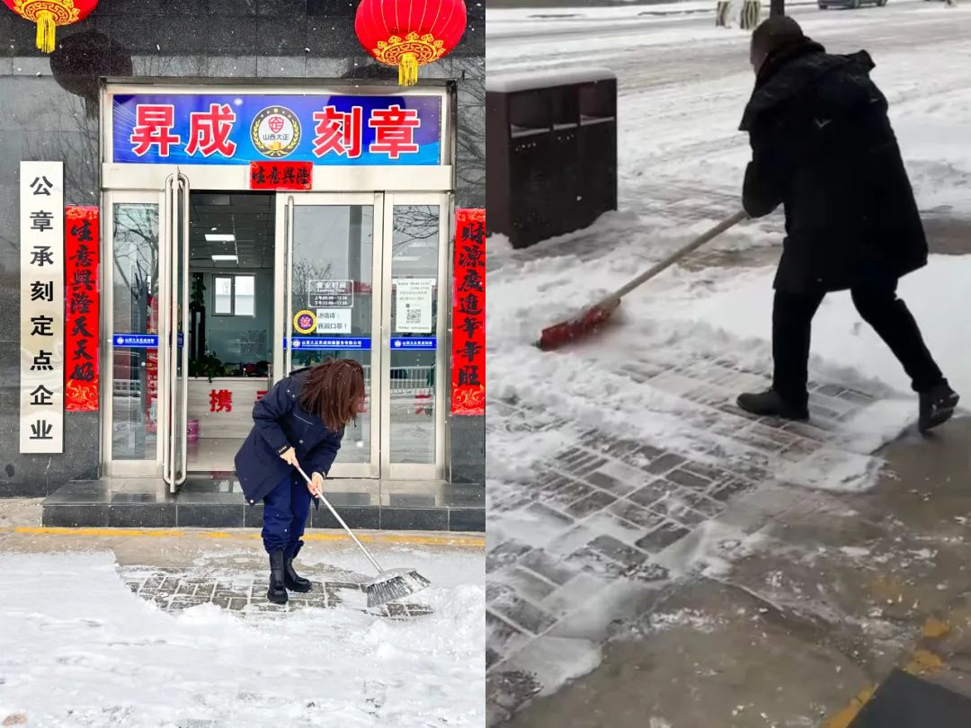 各子(分)公司也在第一時間清掃辦公區(qū)域及周邊的積雪,大家不顧天寒路滑,揮舞著鐵鍬和掃帚,你鏟我掃,分工明確、相互配合,呈現(xiàn)出一派“通力協(xié)作保暢通,熱火朝天掃雪忙”的景象。在隊員們共同努力下,為客戶單位的工作人員出行提供了更加便利、更加安全的環(huán)境,并獲得了客戶單位的認(rèn)可及贊許。