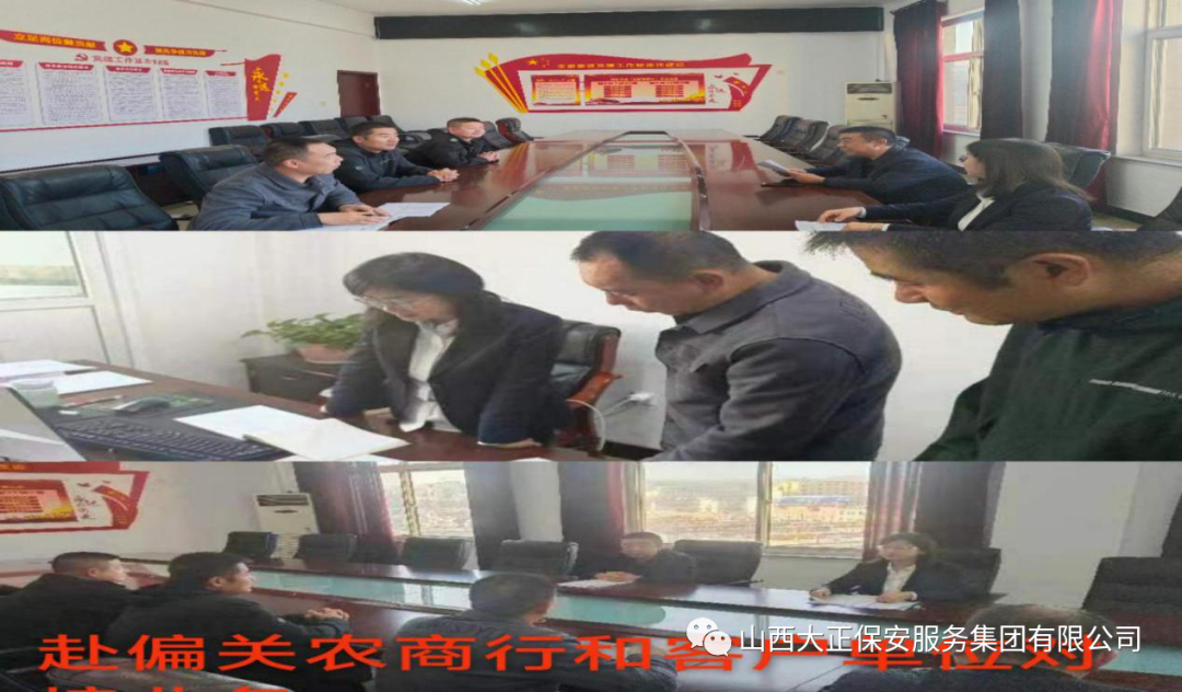人防公司副經(jīng)理牛文亮和樊杰前往偏關(guān)縣農(nóng)商行與客戶單位走訪,巡查了解員工執(zhí)勤情況,安排布置執(zhí)勤要求,并和個(gè)別員工談心交流。檢查執(zhí)勤站點(diǎn)周邊衛(wèi)生,營(yíng)造良好的執(zhí)勤氛圍,就近期保安工作進(jìn)行溝通,客戶對(duì)本公司的安保工作給予了高度認(rèn)可。