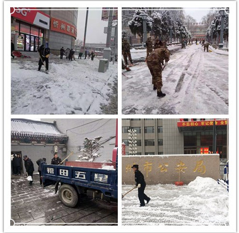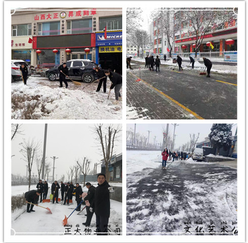 1月5日,2020年紛紛揚揚的一場大雪飄然而至,秀容大地銀裝素裹之間也讓道路覆蓋上了一層厚厚的積雪,不僅給市民出行帶來嚴(yán)重不便,也為公司開展工作帶來諸多安全隱患。為此,公司主要領(lǐng)導(dǎo)親自安排,忻州城區(qū)及各縣分支機構(gòu)迅速行動起來清除積雪,及時清掃各自駐地和周邊道路的積雪,用實際行動為我市創(chuàng)文工作做出貢獻(xiàn)。