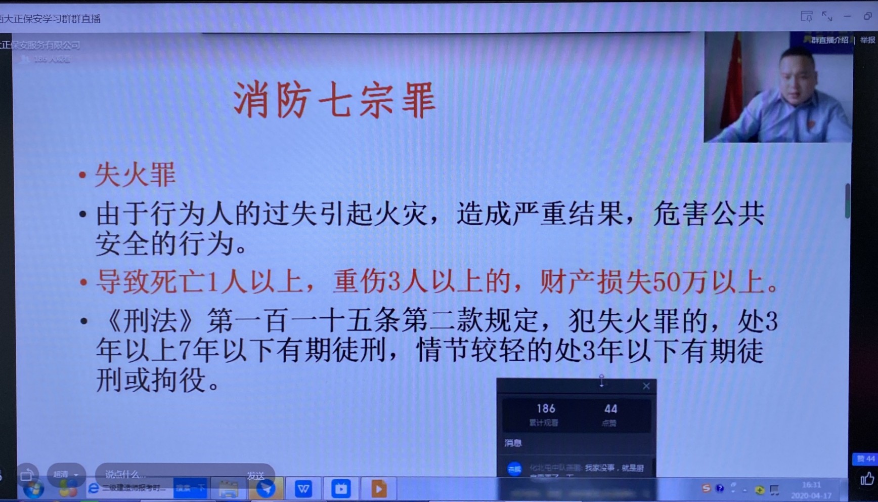 為響應(yīng)國家號召,貫徹“預(yù)防為主,防消結(jié)合”的方針,做到科學應(yīng)對,力求人人講安全,人人會安全。4月17日,公司特邀山西陽光眾安消防科技有限公司忻州分公司講師黃前對我公司員工進行線上安全教學。公司機關(guān)干部、全體黨員等200余人參加。