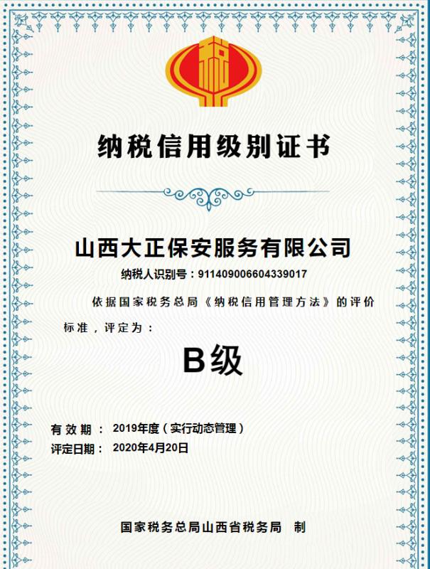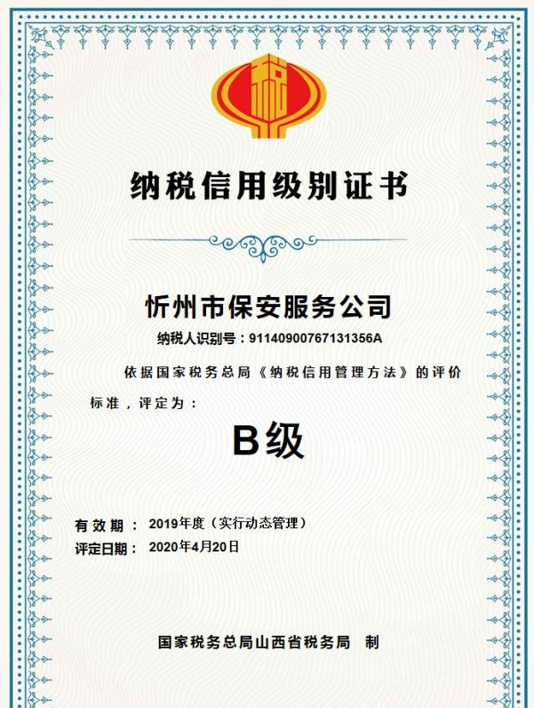 近日,山西大正保安服務(wù)有限公司和忻州市保安服務(wù)公司在國(guó)家稅務(wù)局忻州市經(jīng)濟(jì)技術(shù)開(kāi)發(fā)區(qū)分局的2019年度納稅信用級(jí)別評(píng)定工作中分別獲得納稅信用等級(jí)“B級(jí)”評(píng)定。