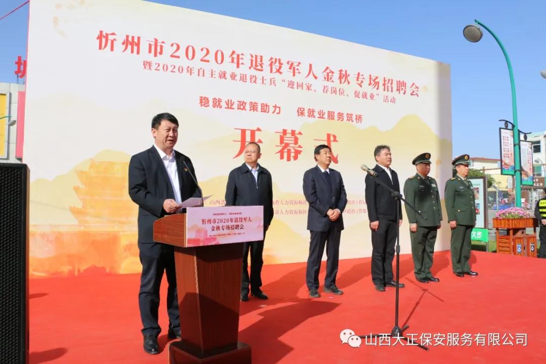 10月21日,由山西省退役軍人事務(wù)廳、山西省人力資源和社會保障廳、山西省軍區(qū)政治工作局主辦,忻州市退役軍人事務(wù)局、忻州市人力資源和社會保障局、山西省忻州軍分區(qū)承辦的忻州市2020年退役軍人金秋專場招聘會于忻州體育廣場舉行,活動以“穩(wěn)就業(yè)政策助力,保就業(yè)服務(wù)筑橋”為主題。山西大正保安服務(wù)集團(tuán)有限公司總經(jīng)理趙培宏作為參會企業(yè)代表上臺發(fā)言,集團(tuán)公司人力資源中心工作人員在現(xiàn)場開展招聘活動。