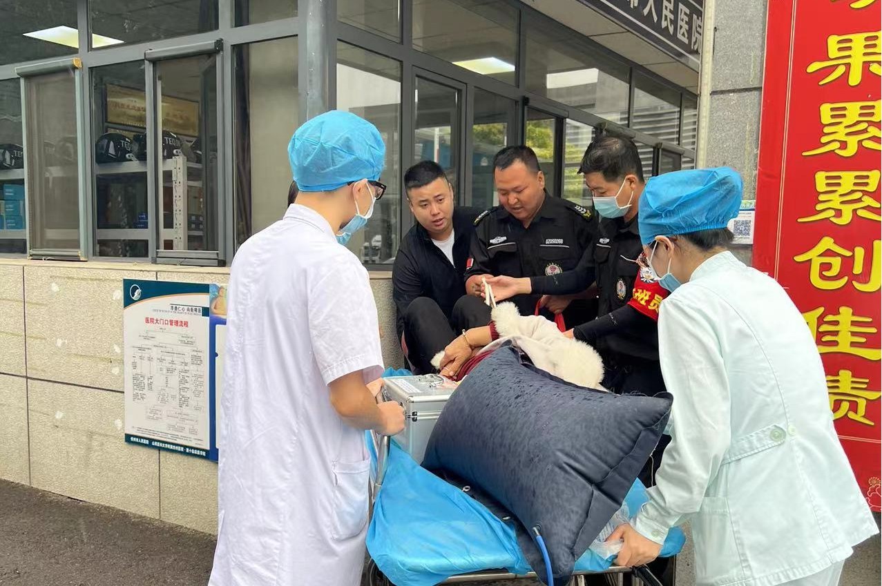 9月19日上午,伴隨著紛紛細(xì)雨,保安直屬公司市醫(yī)院駐勤中隊(duì)和往常一樣繁忙的一天開始了。9時(shí)許,西門人行通道正常查驗(yàn)場(chǎng)所碼過程中,一名中老年婦女只身一人手拎兩個(gè)包步履蹣跚顫顫巍巍走上前來,正在執(zhí)勤的兩名女隊(duì)員發(fā)現(xiàn)后急忙上前攙扶詢問是否需要幫助,話語間,老婦手里的包突然掉落地上,癱倒在女隊(duì)員身邊。在隊(duì)長得知消息后,協(xié)同兩名男隊(duì)員即刻前往急診中心尋求醫(yī)生和擔(dān)架,待醫(yī)生到達(dá)過程中,老婦一直嘴上喊心口疼,并且頭昏,不時(shí)有嘔吐癥狀,一邊嘴上哭訴子女無人陪伴就醫(yī),兩名女隊(duì)員則在其身旁細(xì)心安撫情緒,告知醫(yī)生和擔(dān)架馬上過來。幾分鐘內(nèi)兩名男隊(duì)員和兩名醫(yī)生推著擔(dān)架車一路飛奔急忙趕來,醫(yī)生詢問后,兩名男隊(duì)員將婦女抬上擔(dān)架車,送至急診搶救。