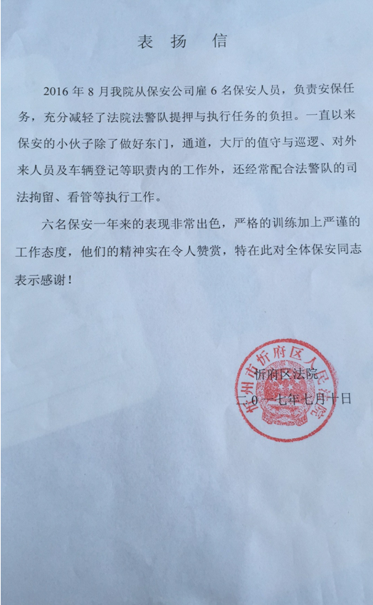 這封表揚信既是忻府區(qū)法院對特勤支隊駐法院中隊日常工作的認可,更是對我支隊工作的肯定。它極大的鼓舞了大家的工作熱情,增強了大家做好工作的信心,同時也給其它中隊做了一個表率作用。